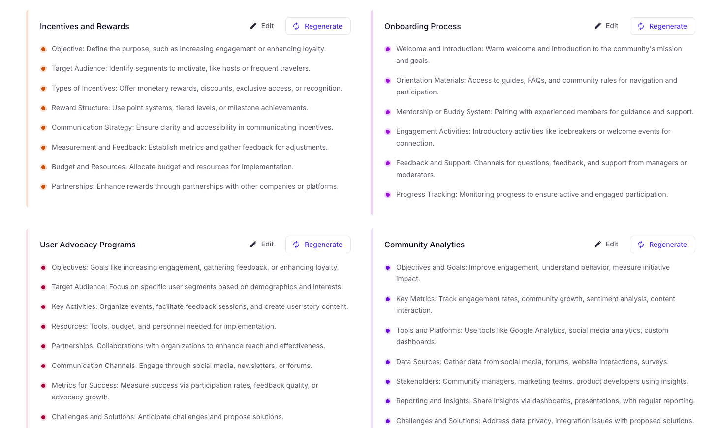 Our canvas helps you move from scattered community efforts to an organized, strategic approach. It ensures you consider all aspects of community building while giving you a shareable document that aligns your team and stakeholders.