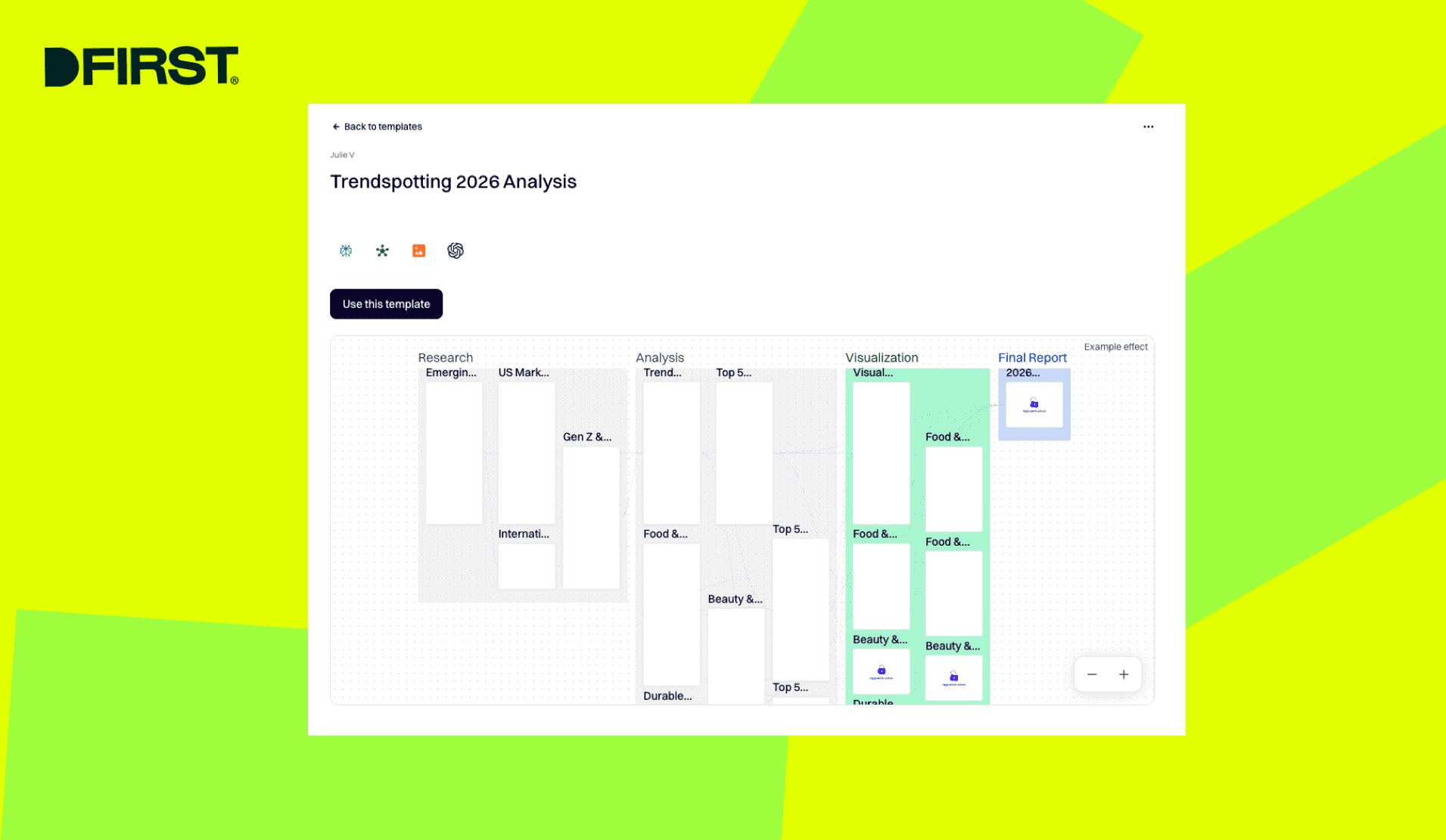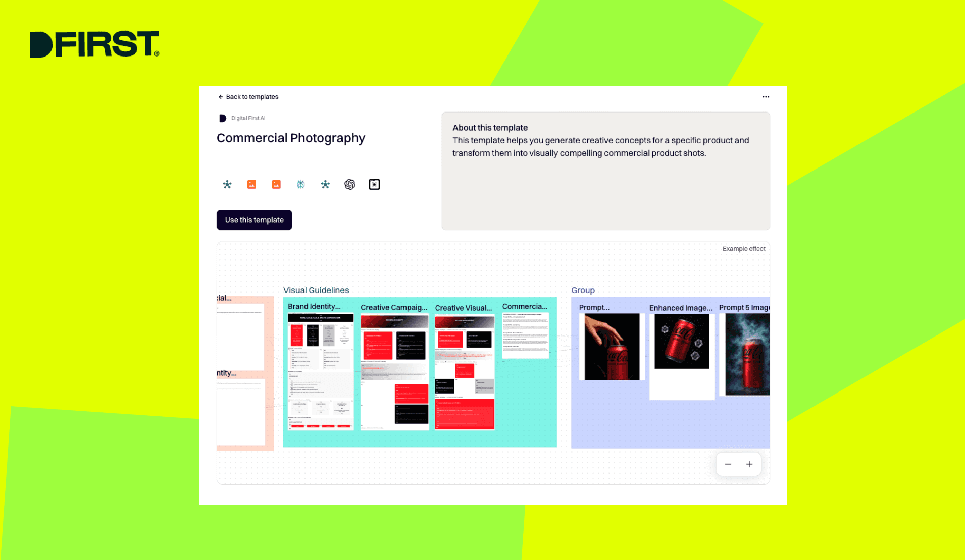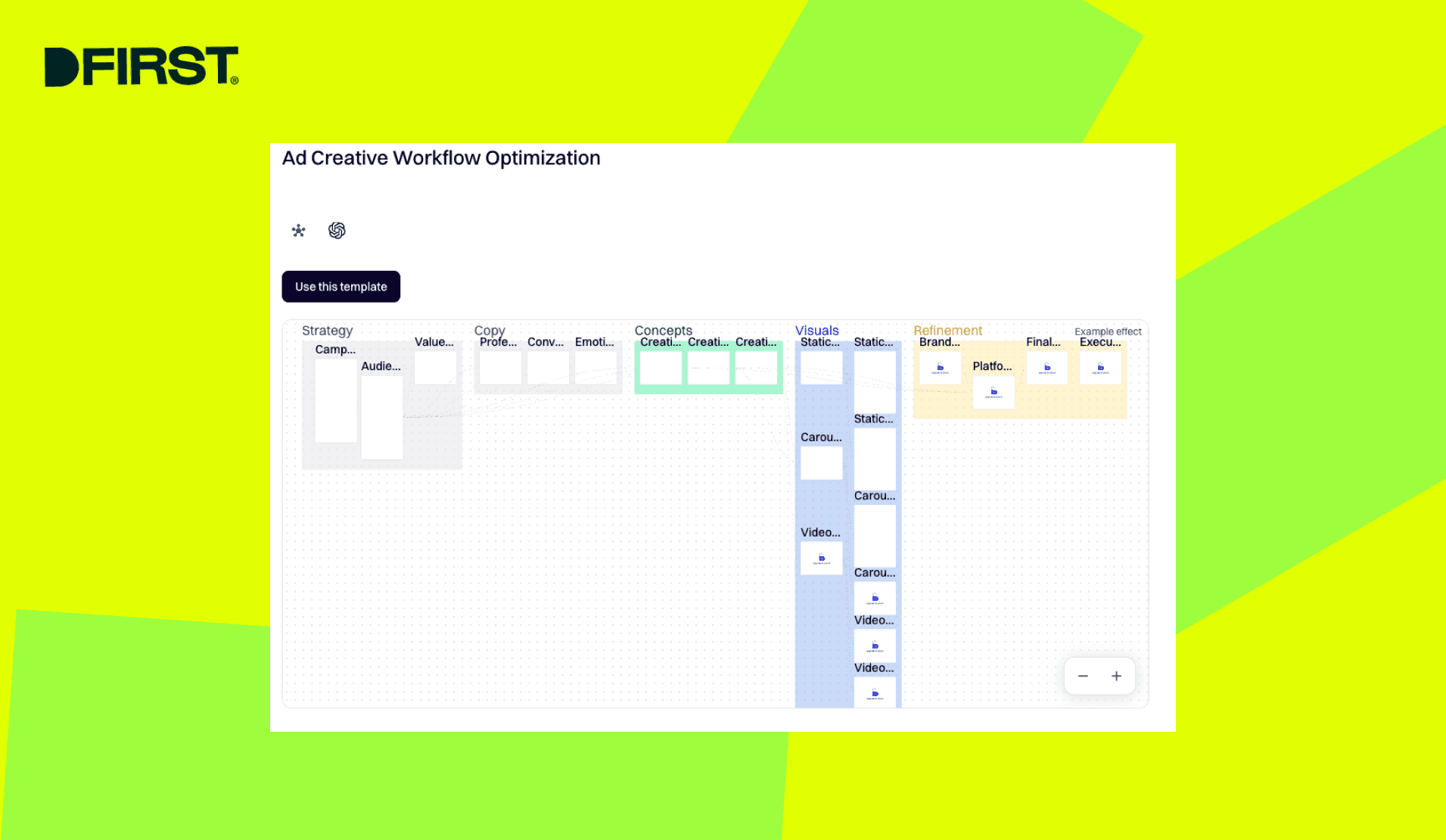 DFIRST is a platform where you connect AI tools on a canvas to create marketing campaigns faster. Instead of juggling multiple apps and manual work, you build workflows that handle everything from research to final ads.