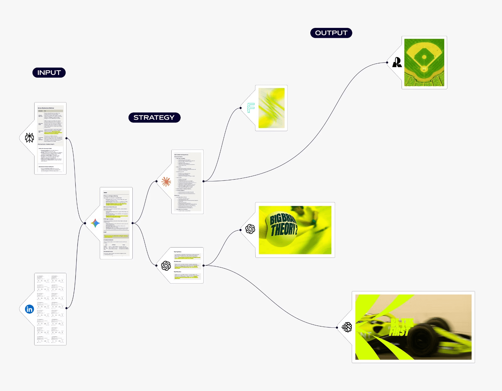 DFirst gives you a visual canvas where you connect research, writing, and design nodes to produce full marketing flows in one place.